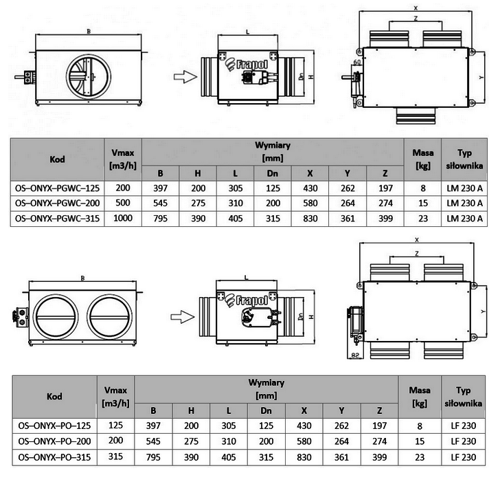 Odcinająca przepustnica kanałowa FRAPOL OS-ONYX-PO/PGWC-200
