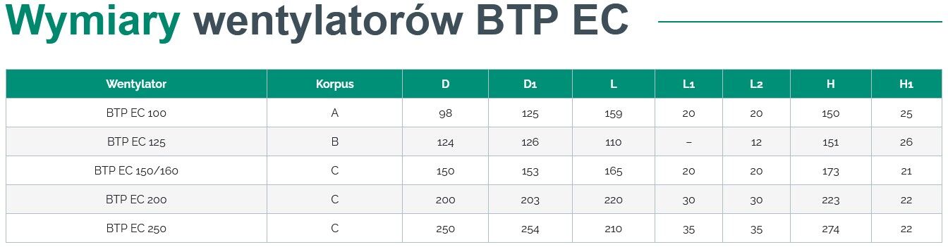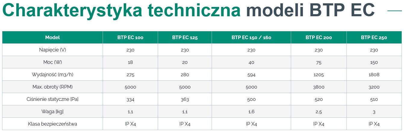 Wentylatory serii BTP EC wykorzystywane są w systemach wentylacji, które wymagają stosunkowo wysokiego sprężu, silnego strumienia powietrza oraz niskiego poziomu hałasu.